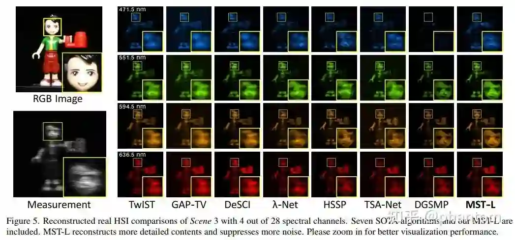 在 simulation 和 real 数据上的定性对比分别如图 6 和图 7 所示。MST 恢复出更多的光谱细节,同时从光谱曲线上来看,也取得了更高的 consistency, 更印证了我们方法的优越性。