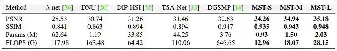 先验货,MST 与 MST++ 与 SOTA 方法对比如图 1 所示,很轴为计算量,纵轴为性能,圆半径代表参数量。MST 与 MST++ 占据了左上角,参数量也非常小,实现多快好省的高光谱图像重建。