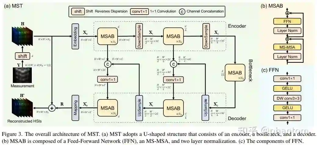 针对从 2D measurement 到 3D HSI cube 的光谱图像复原,我们提出了 Mask-guided Spectral-wise Transformer(MST),如图 3(a)所示。MST 是一个对称的 U 形的网络,其基本组成单元为 Mask-guided Self-Attention Block (MSAB),如图 3(b)所示。MSAB 中最重要的就是 Mask-guided Spectral-wise Multi-head Self-Attention(MS-MSA)。MSAB 包含两个 Layer Normalization(LN),一个 MS-MSA 和一个前向神经网络 Feed Forward Network(FFN),如图 3(c)所示。