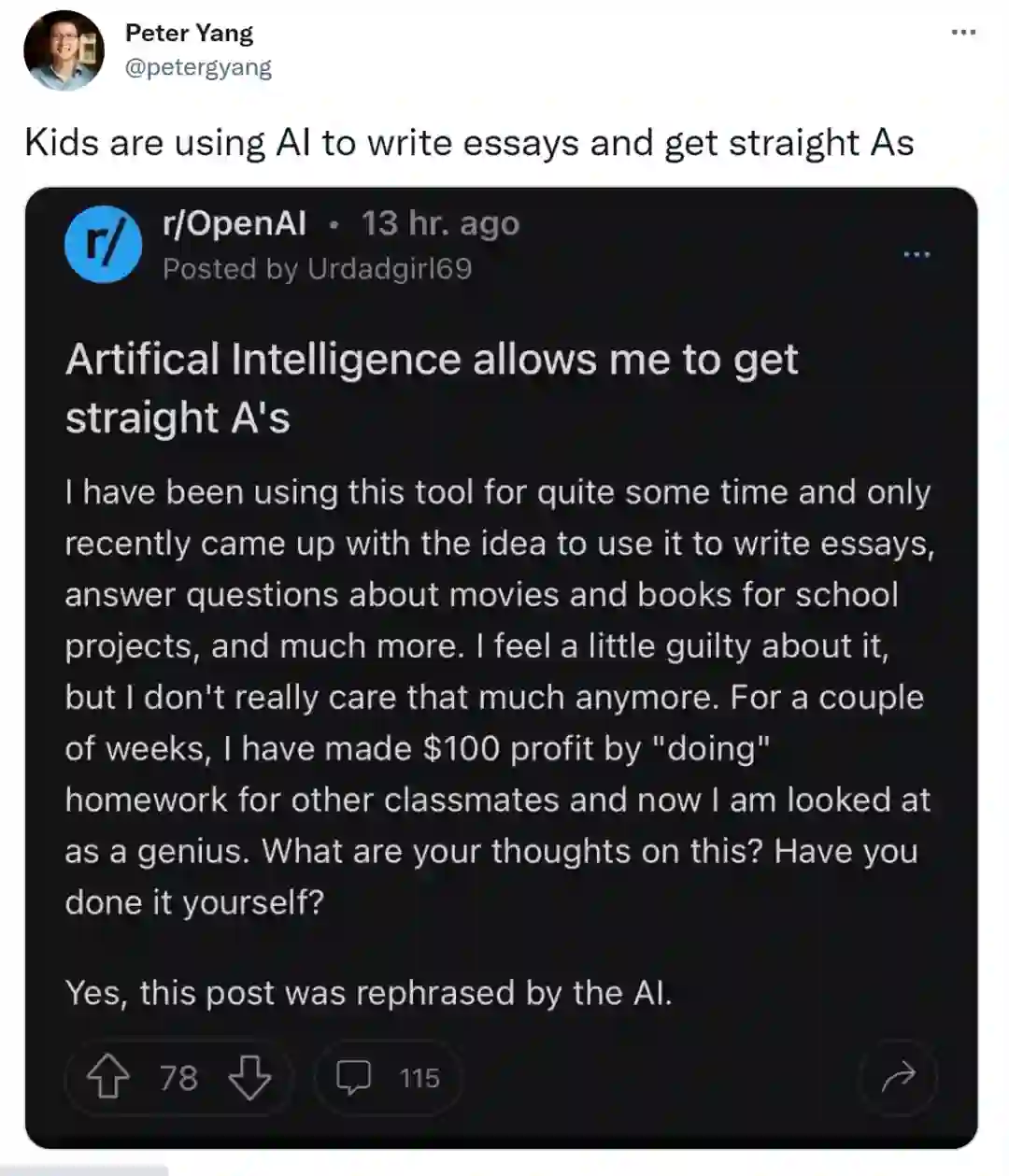 “我仍然做我需要学习才能通过的功课,我只是用人工智能来处理我不想做或觉得没有意义的事情,"innovate_rye补充说。"如果人工智能现在就能做我的家庭作业,那么未来会是什么样子?这些问题让我感到兴奋"。