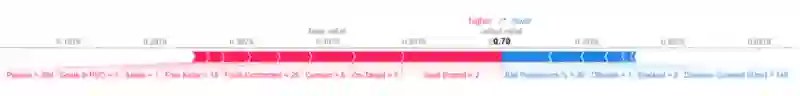 上面的解释显示了推动模型输出从基本值(我们传递的训练数据集中的平均模型输出)到模型输出的每个特性。将预测推高的特征用红色表示,将预测推低的特征用蓝色表示。