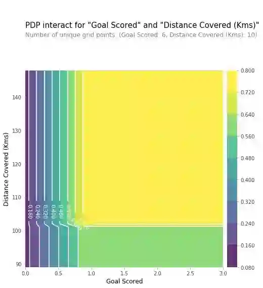 PDP也是在模型拟合完成之后开始计算的。用刚刚足球球员的例子来说,模型使用了很多特征,类似传球数、射门次数、进球数等等。我们从中抽取一个样本球员来进行说明,比如该球员占全队50%的持球时长、传球过100次、射门10次并进球1次。