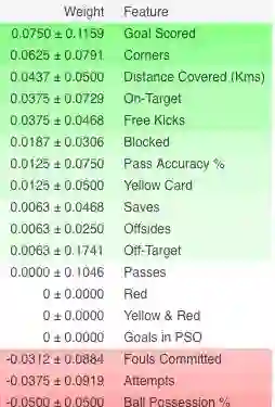 最上面的特征是最重要的特征,最下面则是最不重要的特征。在这个case中,进球数(Goal Scored)是最重要的特征。