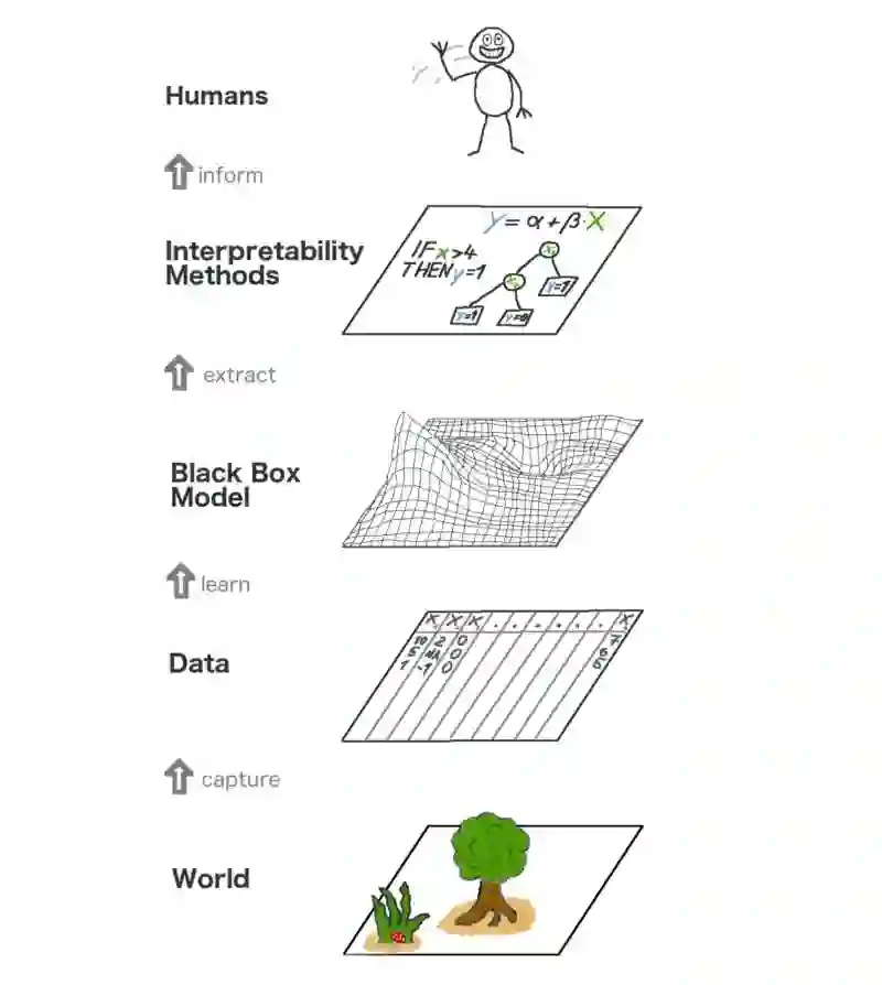 这里有一个可解释机器学习的大框架。在某种程度上,我们通过从真实世界(World)中获取一些原始数据(Data),并用这这些数据进行更深入的预测分析(Black Box Model)。而模型的解释性方法(Interpretability)只是在模型之上增加了一层,以便于人们(Humans)更好地理解预测过程。