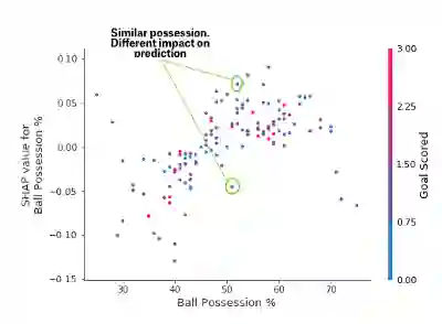 再一次,以足球为例,我们想要预测一个球队有一名球员赢得“最佳球员”的概率。SHAP values解释了给定特性具有特定值的影响,并与我们在该特性具有某些基线值时所做的预测进行比较。