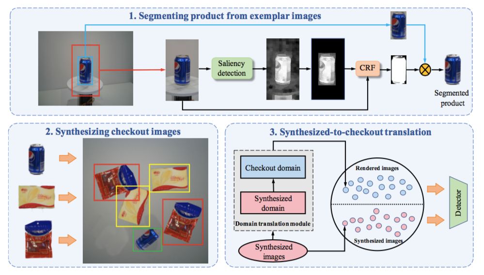 通过把剪裁出来的单品随机粘贴在背景上以合成 10,000 张结算图,接着用其训练检测器,这是第二种基线方法,表示为 Syn。