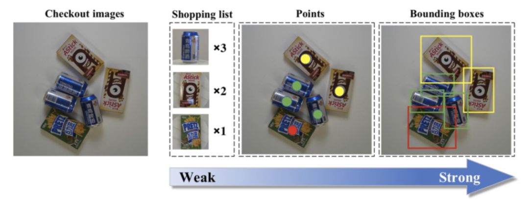 强弱:在监督信息层面,我们为每张 RPC 的结算图均提供了由弱(Shopping List)到中(Point)再到强(Product BBox)的三种强度监督信息。