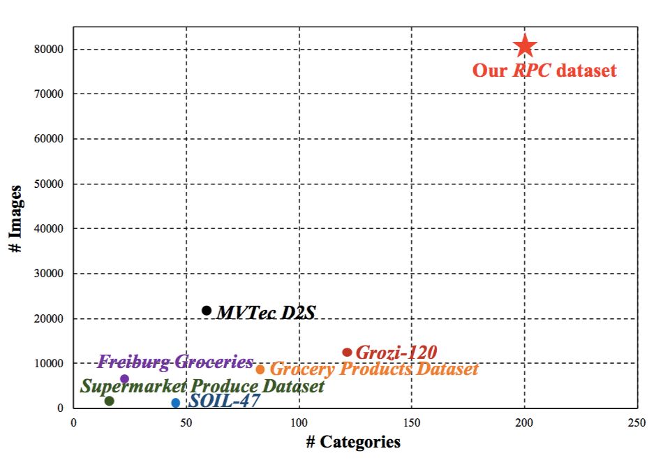 量大:无论是从图像数量还是商品种类(SKU)上来看,RPC 都是该领域之最:SKU 达 200 个,图像数量 83,739 张,其中单品图 53,739 张,结算图 30,000 张。