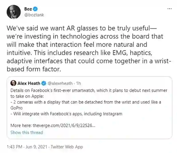 去年 6 月,Facebook 负责AR/VR业务的副总裁 Andrew Bosworth 还在 Twitter 上对「造表」一事做了回应。虽然他没有确认发布智能手表的计划,但也没有完全否认如下细节: