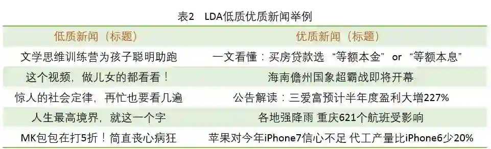 对于新闻 APP,其通过各种来源获得到的新闻,质量通常良莠不齐。在表 2 中列出了一些低质新闻与优质新闻的标题的示例。