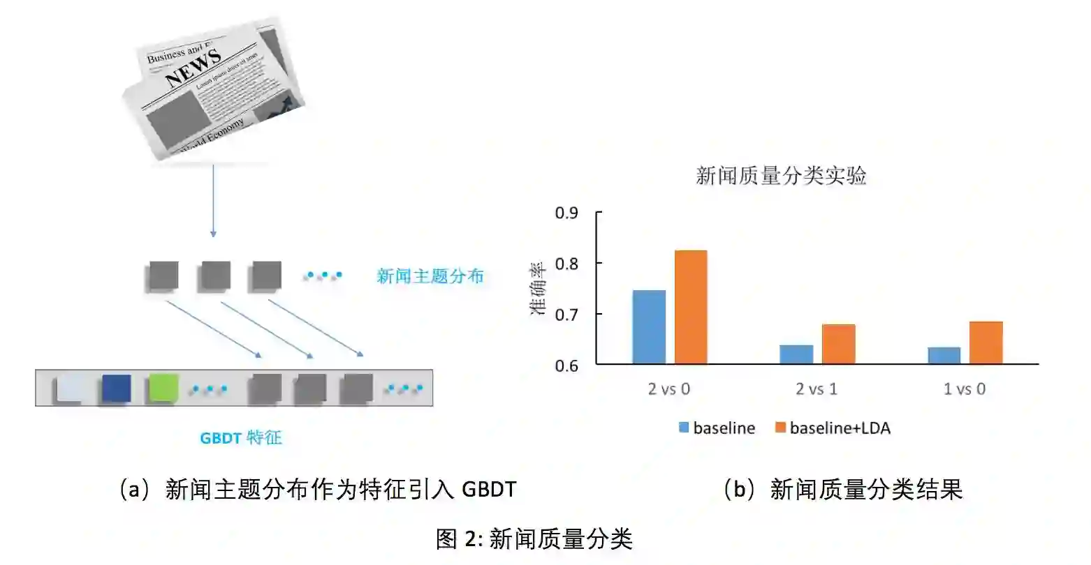 使用人工标注 7000 篇新闻,新闻质量总共划分为 3 个档位,其中 0 档表示质量最差,2 档表示质量最优。采用 Gradient Boost Decision Tree (GBDT),分别利用人工特征和主题扩充后的特征集合在 5000 篇新闻上进行训练,并在另外 2000 篇标注新闻数据上做测试。图 2(b) 展示了使用不同特征上的实验结果,在测试数据上的分类准确度。从这些实验结果可以看出,主题分布作为特征扩充可以有效提升分类器的效果。