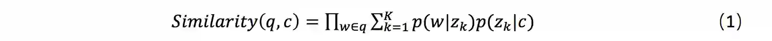 短文本 - 长文本语义匹配的应用场景在工业界非常普遍。例如,在搜索引擎中,需要计算一个用户查询(query)和一个网页正文(content)的相似度。由于 query 属于短文本而 content 属于长文本,我们这时候就会用到短文本 - 长文本语义匹配。在计算相似度的时候,需要规避对短文本直接进行主题映射,而是根据长文本的主题分布,计算该分布生成短文本的概率,作为它们之间的相似度: