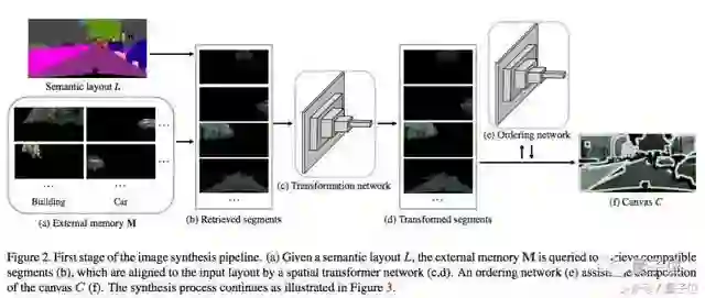 这两步完成后,模型就根据草图切割的形状,提取出记忆库里能对上号的素材,比如说路边的建筑啊,停放好的车辆,以及树啥的。如(b)图所示。