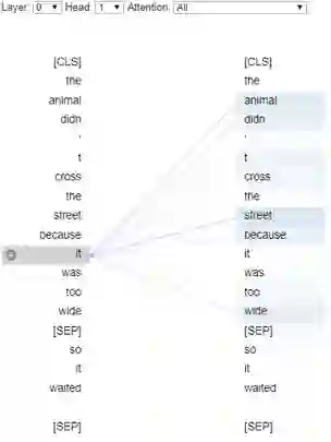 出于解释的目的,我们根据这篇文章(https://medium.com/dissecting-bert/dissecting-bert-part2-335ff2ed9c73)使用的可视化工具来深入研究注意力头,并在预训练的的BERT模型上验证我们的假设。在下面对注意力头的解释中,单词“it”参与到其它所有元素中,看起来它会关注 “street” 和 “animal”这两个单词。