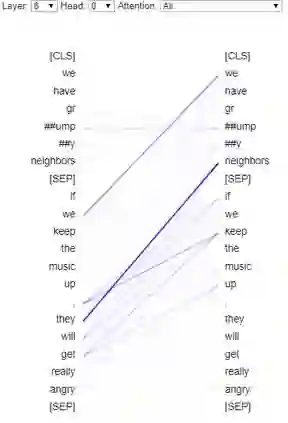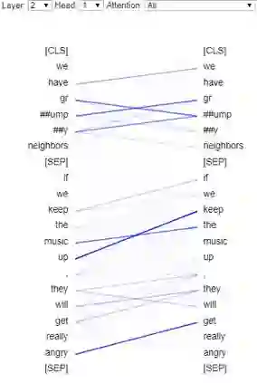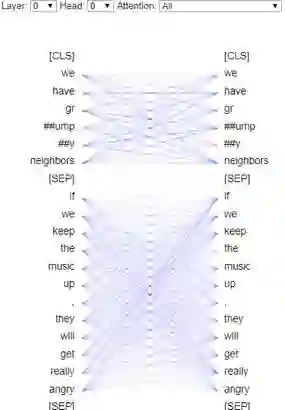 我们忽略了与“[CLS]”和“[SEP]”标记相关的注意力值。我们尝试使用了几个句子,发现想不过度解释它们的结果很难。所以你可以随意用几个句子在这个colab notebook上测试我们的假设。请注意,在图中,左侧序列“注意”右侧序列。