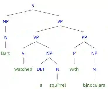 句法解析层次结构以及递归是从组成成分中提取含义,直到达到句子级别,这对于语言理解是一个很有吸引力的方法。考虑到这个句子“Bart watched a squirrel with binoculars” (Bart用双筒望远镜观察松鼠),一个好的句法解析会返回以下句法解析树: