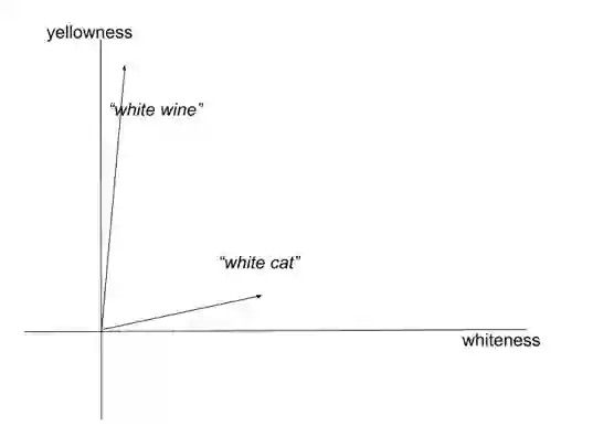 “white wine” (白葡萄酒)和 “white cat” (白猫)在二维语义空间中的表征(空间的维度是颜色)