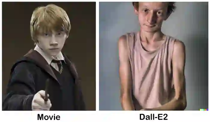 或许你觉得这两个形象大相径庭,并且因为艾玛 · 沃特森的颜值偏爱电影版一些,但不得不说,DALL·E 2 的生成结果是符合原著描述的。