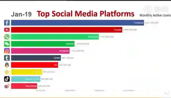 视频来自国外网友RankingtheWorld,展示了从2014年至2019年的5年里,全球社交媒体月活用户的动态变化和排名情况。(内容消费和社交的界限逐渐模糊的情况下,作者把YouTube、QQ空间和抖音均计入榜单)