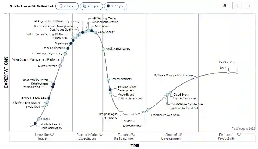这迫使许多团队重新在自动化带来的自由与认知负担之间进行权衡。平台工程也因此越来越受关注和热议。PlatformCon 是第一个面向平台工程师的会议,一出现就吸引了超过 6,000 名与会者。Gartner 也在其 2022 年 8 月发布的软件工程炒作周期中添加了“平台工程”(图中第四个小圆点)。