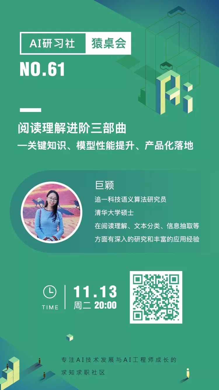 来自追一科技的 巨颖 将为我们分享「阅读理解进阶三部曲——关键知识、模型性能提升、产品化落地 」,千万不要错过~