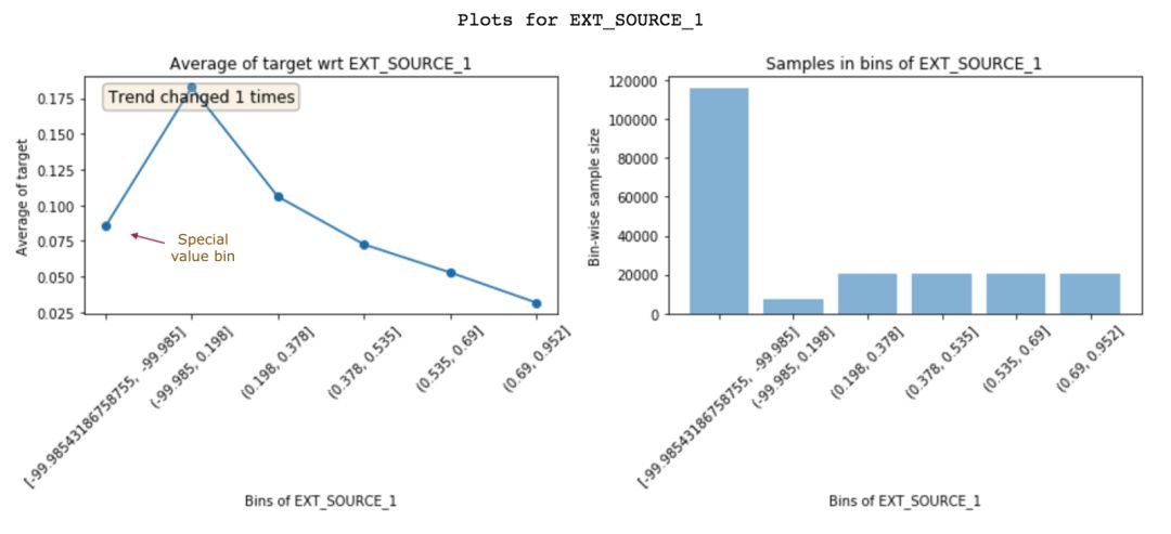 Featexp还帮助您判断特征的重要性。DAYS_BIRTH和EXT_SOURCE_1都有很好的趋势。但是,EXT_SOURCE_1的种群集中在特殊的值柱子中,这说明它可能不如DAYS_BIRTH重要。基于XGBoost模型的特征重要性,DAYS_BIRTH实际上比EXT_SOURCE_1更重要。