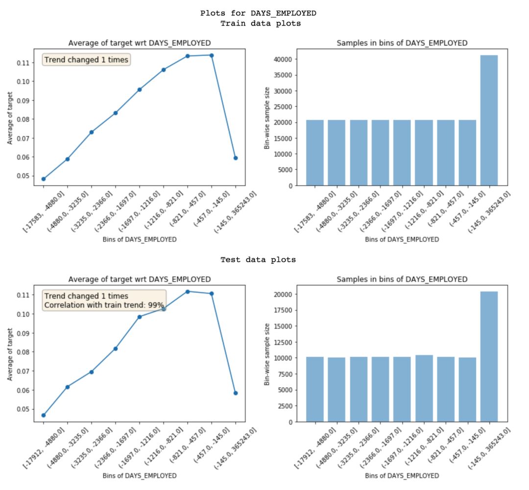 右侧 Featexp 创建了相同人数的柱状图 (x轴)。然后,它计算每个柱子中的目标均值,并将其绘制在上面左边的图中。在我们的例子中,Y坐标 target是平均的违约率。