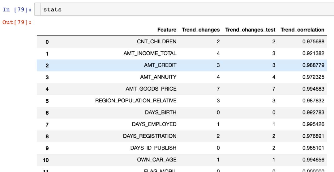 featexp中的get_trend_stats()函数会返回一个具有趋势关联和每个特性变化的dataframe。