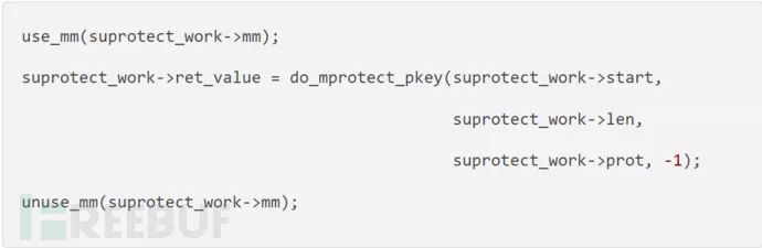 在内核线程中运行代码有一种简单方法,就是内核的工作队列接口,它允许你使用特定例程和特定参数来安排工作。我们的例程获取所需进程的内存映射对象和mprotect的参数,并执行以下操作(do_mprotect_pkey是内核中实现mprotect和pkey_mprotect系统调用的内部函数):