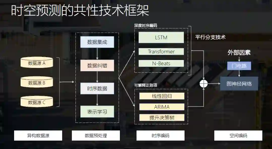 同样,时空预测也有一些共性的特点,例如数据噪声大,信息缺失严重;时序的模式非常多样,有趋势、周期、突发信号;空间结构很复杂,经常会出现一些层次化的结构,使得我们不能够单一地在单点上进行预测。