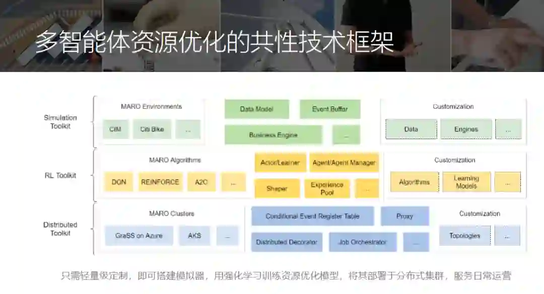 认识了这些挑战之后,我们和合作伙伴共同开发了一套多智能体资源优化的共性技术框架。该框架只需要经过非常轻量级的定制就可以帮助客户搭建起属于自己的模拟器,并且还可以用强化学习的手段训练一个高效的智能体,帮客户实现资源优化。而且我们可以很轻易地帮助客户把这个模型部署在一个分布式集群上,实现他们的日常运营。目前,这个框架已帮助包括东方海外航运在内的多个客户实现了更加高效的日常运营,提高了效率,降低了成本,获得了更好的资源利用率。