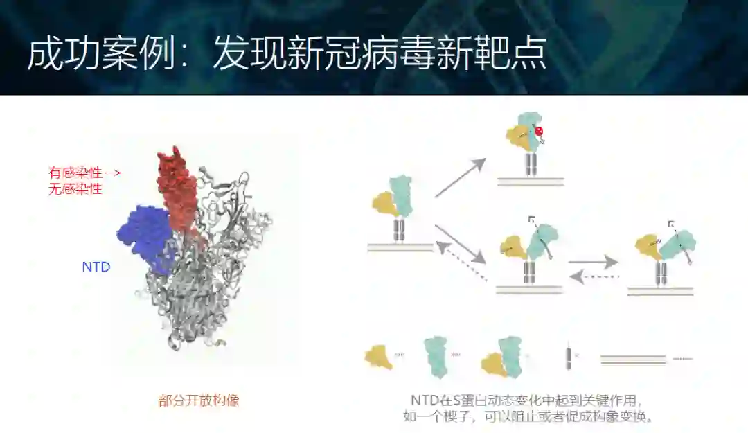 过去一年,微软亚洲研究院使用人工智能技术,建立了一个大规模的分子动力学模拟系统,并且使用这个系统对新冠病毒 S 蛋白的动态变化进行了深入分析,我们发现了一些非常有价值的科学结论。例如,我们发现新冠病毒 S 蛋白一直在具有高传染性的开构象和低传染性的闭构象之间做着构象的转化,而在这个转化过程中,S 蛋白的 NTD 部分起到了非常关键的作用,它就像一个楔子,可以促进或者阻止这种构象的变化。