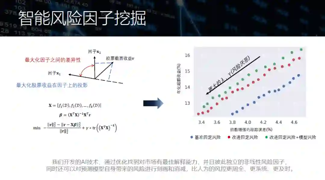 同样,关于风险控制,这是一个非常持久且重要的话题,只有我们对风险有了非常好的控制,才能实现稳定的投资。虽然这个话题很重要,但是在历史上人们对风险因子的研究道路崎岖、发展缓慢。历史的做法通常是,由专家定义出少量用来解释当前市场的因子,然后考察特定投资组合在这些因子上的暴露情况。从经典的 CAPM 模型发展到 Fama TFM 模型历时31年,仅增加了 Value、Size 几个少量的因子。而从 Fama 模型进化到当前大多数投资机构都在使用的 BARRA 模型,又经历了20年,也不过只增加了成长、动量等少数因子。而人工智能则可以通过优化的手段,自动找到对市场有最佳解释能力并且彼此相互独立的非线性风险因子,同时还可以对预测模型自身带来的风险进行刻画和消减。这样一来,我们用人工智能的手段去做风控,就可以比人类专家更周全、更系统、更及时。