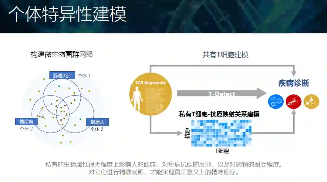 此外,个体差异方面同样非常重要。我们每个人都有不同、大量的私有免疫细胞,体内的微生物菌群也大相径庭。所有这些私有的生物属性很大程度上影响了人类的健康,以及个体对于不同疾病抗原的反应和药物的耐受程度。只有对它们进行精准的刻画,才能实现真正意义上的个性化医疗。