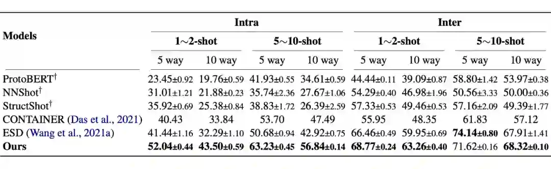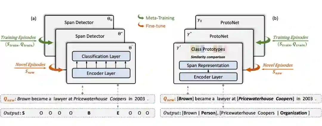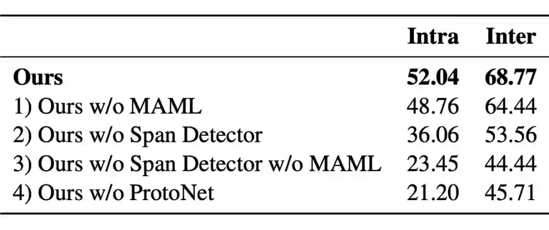 本文提出了一个两阶段的模型,跨度检测和实体分类来进行小样本 NER 任务,两个阶段的模型均使用元学习 MAML 的方法来进行增强,获取了更好的初始化参数,能够使模型通过少量样本快速适配到新域中。本文也算是一篇启发性的文章,在指标上可以看出,元学习的方法对小样本 NER 任务有着巨大的提升。