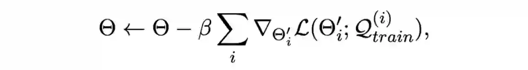 其中 Un 代表 n 步梯度更新,损失采用上文所述的损失函数。然后使用更新后的参数 Θ' 在查询集上进行评估,将一个 batch 内的所有 episode 的损失求和,训练目标是最小化该损失: