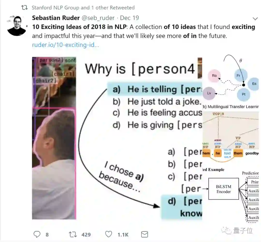 最近,爱尔兰的NLP研究科学家Sebastian Ruder写一篇文章,基于12篇经典论文盘点了2018年NLP领域令人激动的十大想法。