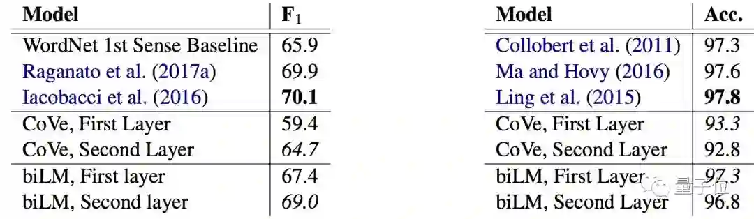 词义消歧( WSD )分析(下图左)执行得很好。两者都表明了,LM提供的词义消歧和词性标注(POS)表现都接近最先进的水平。