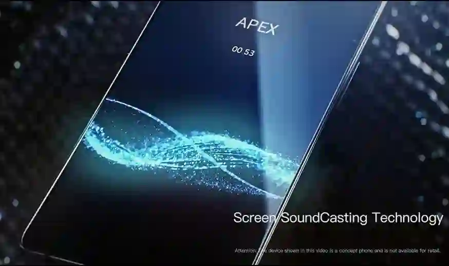 其实早在2018年,首款 APEX 概念机,就通过屏幕发声技术解决了听筒的开孔问题,耳朵贴近屏幕任何一处,都可以听到清晰的声音,而在 APEX 2019上,vivo 将声音传导单元紧密贴合在一体化玻璃后盖上,通过震动发声,实现真正的零音孔设计。