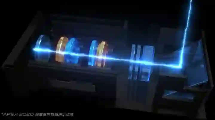 APEX 2020 的光学变焦镜头采用了“4群组镜片组合”,也就是两个群组固定,两个群组可移动,能同时实现高倍率连续变焦和实时对焦功能,潜望式设计则让镜头在保证功能性的前提下,机身依旧纤薄。
