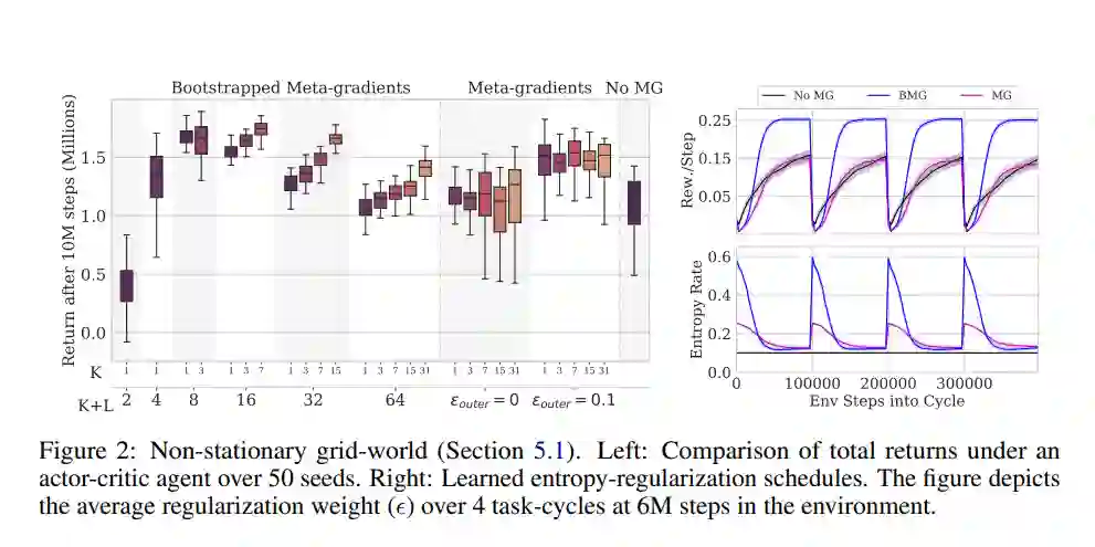 非稳态网格世界(第 5.1 节)左:在超过 50 个随机种子之中,演员 - 评价者代理下的总回报对比。右:学习的熵值 - 正则化的时间表。