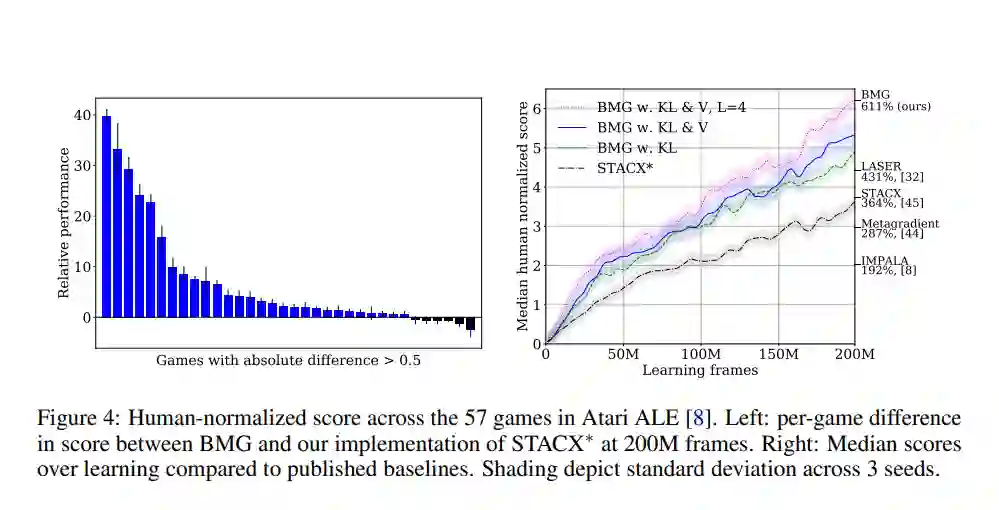 在 Atari ALE[8] 的 57 种游戏中,人类得分标准化。左:2 亿帧时,对比 BMG 与我们实现的 STACX* 的赛前得分。右:对比公布的基准线与学习得分中位数。阴影部分表示 3 个随机种子之间的标准偏差。