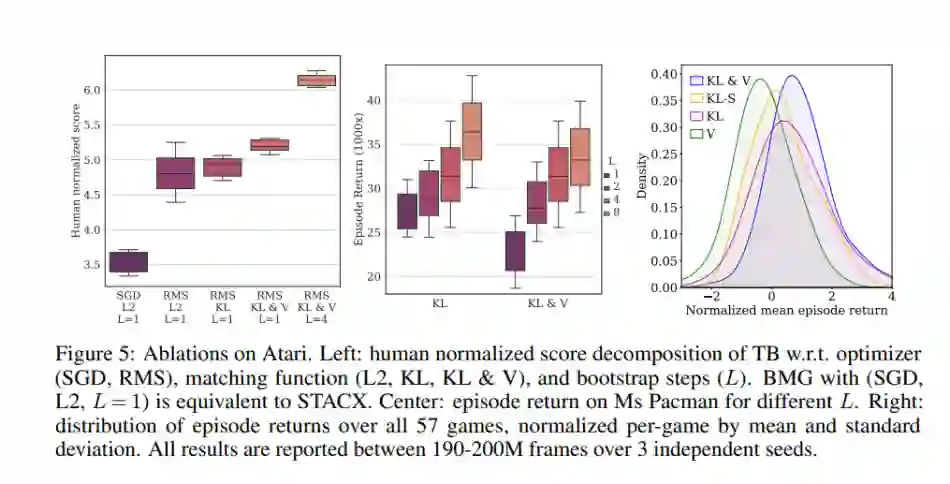 Atari 的消融实验。左:人类标准化得分分解,优化器(SGD,RMS),匹配函数(L2,KL,KL&V),以及引导式步骤(L)。BMG 在(SGD,L2,L=1)的情况下与 STACX 相同。中:不同 L 下吃豆人关卡返回。右:在 57 种游戏中关卡返回的分布,按照平均值和标准偏差对每种游戏进行标准化处理。所有结果均为三个独立随机种子,1.9-2 亿帧之间观察所得。