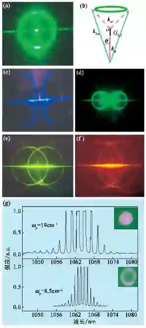 如果入射波矢平行于 LT 晶体的x轴, 入射波长为1064nm, 初基倒格矢 G01参与准位相匹配, 其准位相匹配条件为k2ω-(kω+kω')-G01=0,满足上述条件的诸波矢k2ω的集合,构成了半顶角为θ 的圆锥面,见图 6(b). 因而在屏幕上的投影为一圆, 见图 6(a). 如果入射波矢平行于 LT晶体的x轴, 入射光的波长为 933nm,一对镜面对称的非初基倒格矢G11参与准位相匹配, 在屏幕上的投影是一对具有镜面对称的双环,参阅图 6(c). 值得注意的是, 初基倒格矢 G10和非初基倒格矢G11及其相应的等效倒格矢,都镜面对称地分布在 y轴两侧, 而沿 y轴不存在初基倒格矢,见图2(d). 如果入射波矢平行于 LT 晶体的 y 轴,一对初基倒格矢 G10参与准位相匹配, 或一对初基倒格矢 G10和一对非初基倒格矢 G11同时参与准位相匹配, 其倍频光在屏幕上的投影如图 6(d),(e),(f)所示. 关于非弹性散射, 我们仔细研究了拉曼散射, 证实了同样存在准位相匹配增强效应, 并通过实验将散射强度提高了 104-105倍. 这就为设计新型拉曼激光器和发展高分辨拉曼谱学提供了新途径.