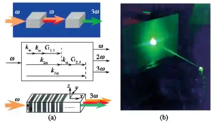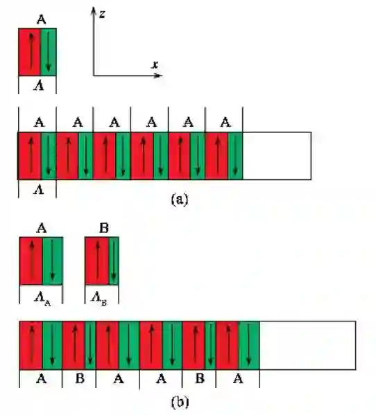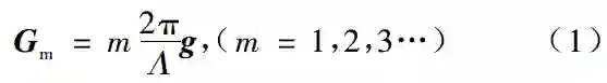 1962年, Bloembergen提出的准位相匹配理论指出,在任何光参量过程中, 由于折射率色散所引起的波矢量失配(位相失配), 可用超晶格提供的倒格矢来补偿. 例如, 倍频过程, 其折射率色散引起波矢量失配为 ∆k=k2ω-kω=2ω/c [n(2ω)-n(ω)]κ,设计周期超晶格, 使其初基倒格矢G1=∆k=2ω/c [n(2ω)-n(ω)]κ,故有