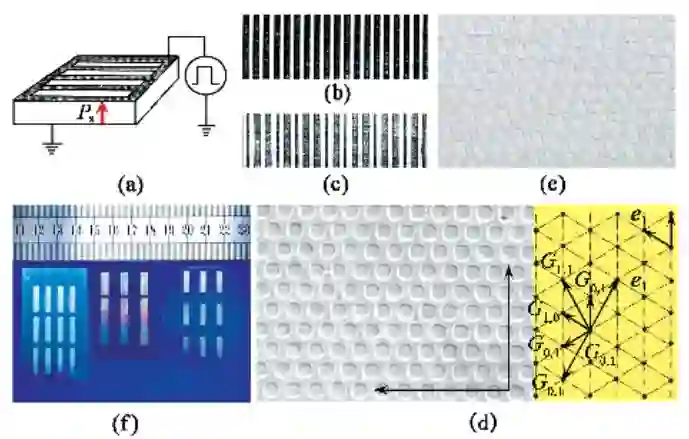 为了制备准周期超晶格,借用半导体平面工艺.取一片z切割的单畴LN或 LT晶片,在其上、下晶面沉积金属膜作为电极. 下晶面的金属膜为平面电极,上晶面的金属膜通过半导体平面工艺刻蚀成具有周期、准周期、或其他有序图案的电极, 二电极与高压脉冲发生器联结,如图2(a)所示(图中 Ps为自变极化矢量). 在高压脉冲电场作用下, 单畴晶片中的反向畴首先成核于上电极界面处,逐步向下延伸. 适当选择脉冲强度、脉冲宽度和脉冲重复频率,可使反向畴贯穿整个样品, 获得与图案电极相同的有序畴结构. 这被称为室温电场极化技术. 图 2(b),(c)和(d)是用该技术制备的周期、准周期和二维周期超晶格,图 2(e)是具有特定图案的有序畴结构. 该技术能用于批量生产,图 2(f)表明晶片上同时制备的多个相同和不同的超晶格.