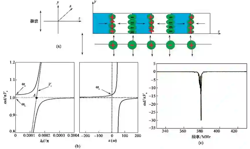 图 7 微波与超晶格振动耦合. (a)离子型声子晶体示意图;(b)极化激元的色散与介电异常;(c)极化激元激发引起的微波吸收