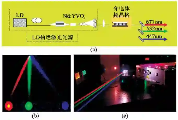 图5 超晶格三基色全固态激光器(a)三基色激光器示意图;(b)实验观测结果;(c)三基色全固态激光器实物图
