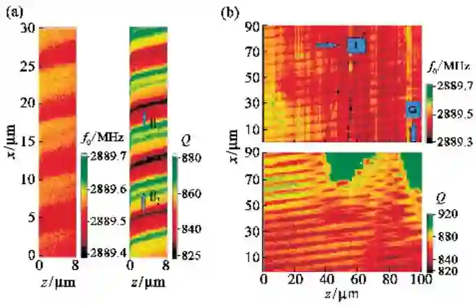 其中实部ε'为介电常数, 虚部ε''为介电损耗. 系统的共振频率为 f0,有∆f0/f0=g∆ε',其中常数g=∽7.1×10-5( 给定实验系统的测量值), 故共振频率像反映了介电常数的变化, 因而能反映晶体中的掺杂浓度和内应力, 参阅图3(a)的左图. 系统的品质因子为(1/Q), 有 ∆(1/Q)=g'∆ε'', 其中g'=∽7.1×10-2,品质因子像反映了介电损耗(微波吸收)的空间变化,与微波作用下的离子位移和畴界振动有关,显然,畴界处介电损耗最大,参阅图3(b)的右图. 图3(b)对比了 LN超晶格的同一区域的两种像, 上图为介电常数像,下图为介电损耗像. 可以看出, 在该区域的右上部, 介电常数像(上图)与介电损耗像(下图)中的周期结构遭到破坏, 在介电损耗像(下图)中出现绿色区(其介电损耗最大), 这对应于岛屿畴分布区. 岛屿畴区内畴界密度较大,因而介电损耗亦大. 岛屿畴区的出现是晶体生长过程中界面失稳所致. 微波近场显微术不仅能表征超晶格中的周期畴结构,还能提供超晶格中的溶质分布、内应力分布、双折射的均匀性以及微波吸收分布的有关信息.