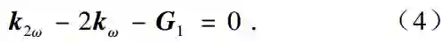 介电体以介电极化为特征, 介电极化来源于电子极化和离子(位移)极化. 在光频波段离子的位移跟不上光波的变化,因此只有电子极化作出贡献. 这里考虑二阶非线性极化. 当共线的频率为 ω1 和 ω2的光作用于非线性介质时, 引起的二阶非线性极化强度含有2ω1,2ω2, ω1±ω2 等不同频率分量, 相应的极化分量将辐射上述频率分量的光波. 但要获得这些频率分量的有效输出, 其相应的光参量过程必须满足能量守恒和动量守恒. 以和频为例,为了使能量有效地从频率为ω1和 ω2的基波光转换到频率为ω3的和频光, 必须满足的能量守恒为ω3=ω1+ω2和动量守恒为 k3=k1+k2, 或 k3-(k1+k2)=0. 其中ki=n(ωi)/c ωiκ,(i=1,2,3), ki是频率为 ωi的光的波矢,κ是 ki的单位矢量, 三波矢是共线的. 这里动量守恒用波矢量守恒表达,通常称为位相匹配. 若ω1=ω2=ω, 即 kω1=kω2=kω, 由能量守恒, 有 ω3=2ω,由波矢量守恒, 即k2ω-kω=0, 有 n(2ω)=n(ω),此为倍频情况. 可以看出,位相匹配要求基波光与倍频光的折射率相等, 亦即要求在介质中基波光与倍频光的相速度相等. 然而由于折射率色散效应,n(2ω)≠n(ω),必然产生位相失配. 利用晶体的双折射效应,在特定的方向上可以实现基波光和倍频光的相速度相等,从而得到高效输出. 这就是光学工程中通常使用的位相匹配技术.